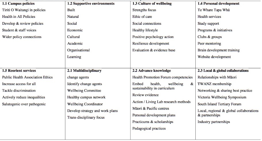 The built environment can be designed to enhance interpersonal safety and access, and promote physical activity. This could include incorporating sustainability and universal design principles on campus development projects, engaging students in capital works programs, and providing disabled access and accommodation. Natural environments support sustainable practices, such as working towards a low carbon energy scheme on campus, developing community gardens, and waste reduction. Supportive social environments can include pastoral care for diverse student groups, student advocacy, and wellbeing spaces. Supportive economic environments can include zero fees schemes for students, scholarships and emergency fund provision. Supportive cultural environments influence how welcome and engaged people feel on campus, such as bicultural competency building, bilingual childcare, Confucius centres (promoting Chinese language and culture), multi-lingual staff, and the rainbow tick (awarded to organisations completing sexual and gender diversity certification). Supportive organisational environments can include diverse learning needs, staff development and supervision, and fair trade accreditation. Lastly, supportive academic and learning environments can include student representatives on programs, reviews of demanding courses and barrier free trust audits.